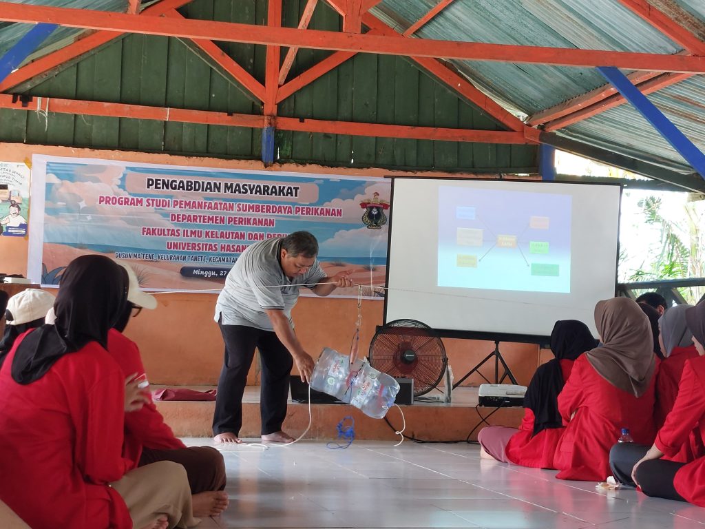 Two main speakers were featured during the activity. Dr. Ir. Andi Assir, S.Pi., M.Sc., delivered a presentation on the construction of traps (bubu) using recycled bottles, offering an innovative solution to support sustainable fishing practices. Meanwhile, Dr. Ir. Alfa Nelwan, S.Pi., M.Si., presented material on aquatic ecosystems and their relationship to the use of environmentally friendly fishing gear, providing crucial insights into the importance of maintaining ecosystem balance in fishing activities.