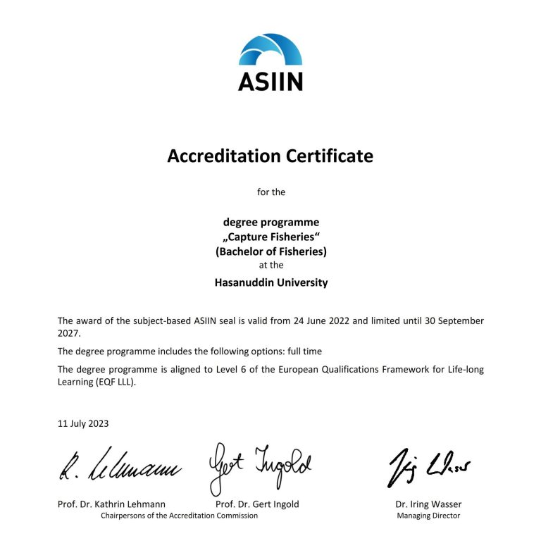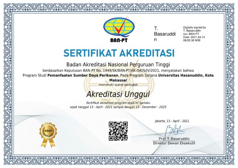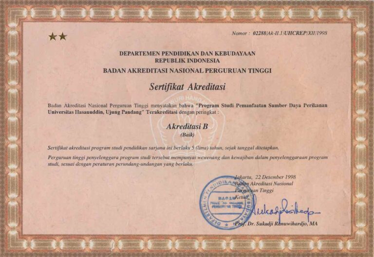 The Capture Fisheries Study Program, Faculty of Marine Science and Fisheries Science, Hasanuddin University holds "B" acreditation based on number 02288 / Ak-II.I / UHCREP / XII / 1998. That applies from December 22, 1998 to December 22, 2003