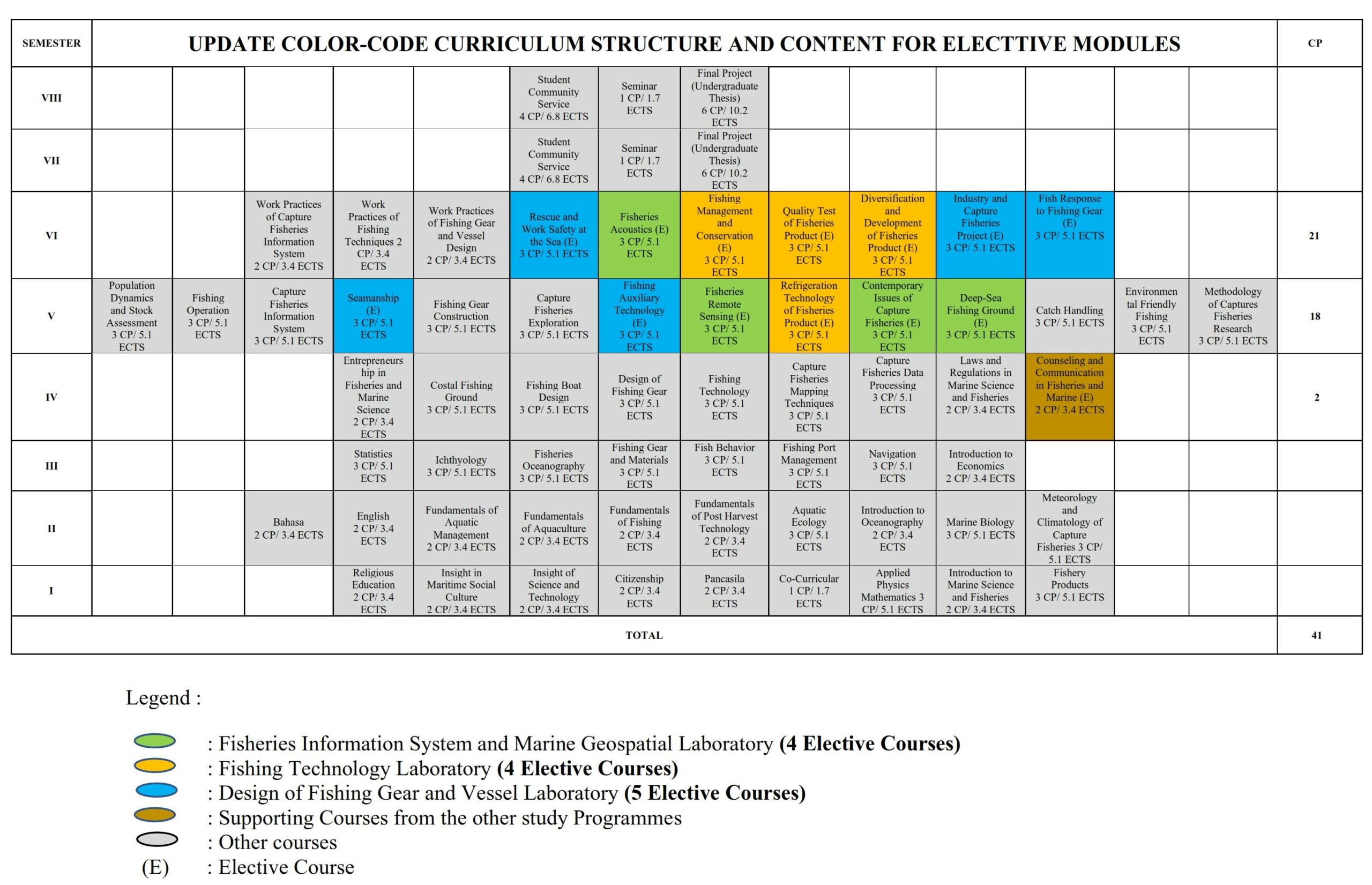 Whereas the total of elective courses (41 credit points) consists of 39 credit points (13 courses) from the Capture Fisheries Study Program and 2 credit points (1 course) from another study program,